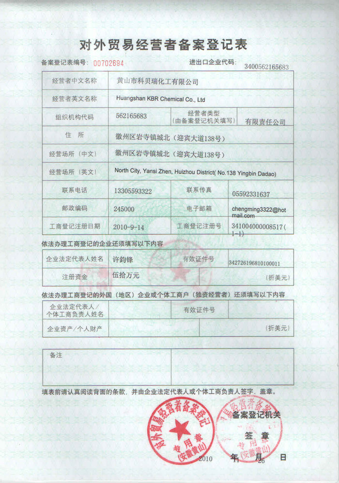 Huangshan KBR New Material Technology Co., Ltd. product development and application involve chemical, construction, paint coating, electronic, casting, textiles, plastics, rubber, etc. Various kinds of fields; pay special attention to the study of improving product functionality and product environmental protection performance, to provide quality products and services, assist customers effectively to improve product quality, reduce product cost and improve product environmental protection performance.
